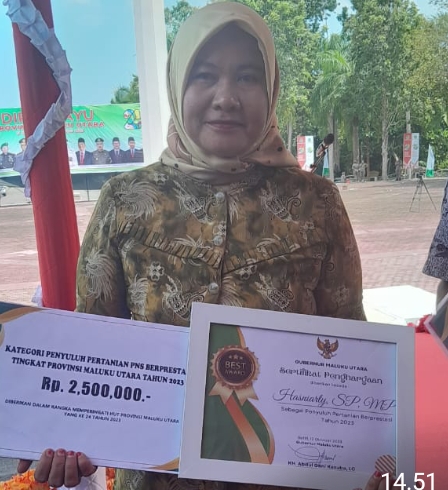 Hasilnya, Hasnarty dinyatakan lulus sebagai penyuluh pertanian berprestasi dan diundang mengikuti upacara HUT Provinsi Maluku Utara ke 24 Tahun 2023 yang dilaksanakan di halaman Kantor Gubernur, Gosale Puncak Kelurahan Guraping, Kamis (12/10).
