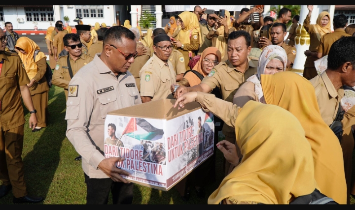 Aksi kemanusiaan ini dipimpin langsung oleh Wakil Walikota Tidore Kepulauan, Muhammad Sinen pada Apel Akbar dan Doa bersama untuk Palestina oleh ASN, Non ASN, Para Guru dan Kepala Sekolah Lingkup Pemerintah Kota Tidore Kepulauan, di Halaman Kantor Walikota Tidore, Senin (23/10/2023).