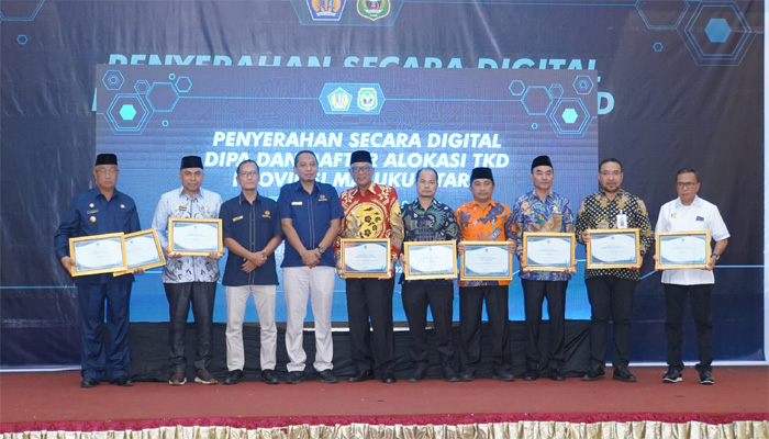 Penghargaan tersebut diserahkan oleh Gubernur Maluku Utara KH, Abdul Gani Kasuba, didampingi Kepala Perwakilan Kementerian Keuangan (Kanwil Perbendaharaan) Maluku Utara Tunas Agung Jiwa Brata kepada Walikota Tidore Kepulauan Capt. Ali Ibrahim saat menghadiri Penyerahan secara digital DIPA dan Daftar Alokasi TKD Provinsi Maluku Utara, di metting room royal resto , Ternate, Kamis (14/12/2023).