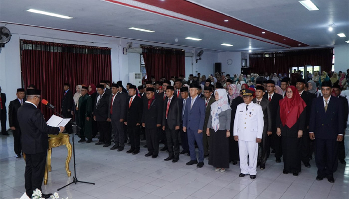 Upacara pelantikkan dan pengambilan sumpah jabatan tinggi pratama, jabatan administrator, camat, lurah, jabatan pengawas dan jabatan fungsional yang berlangsung di Aula Sultan Nuku, Kantor Walikota Tidore, Jumat (29/12/2023)