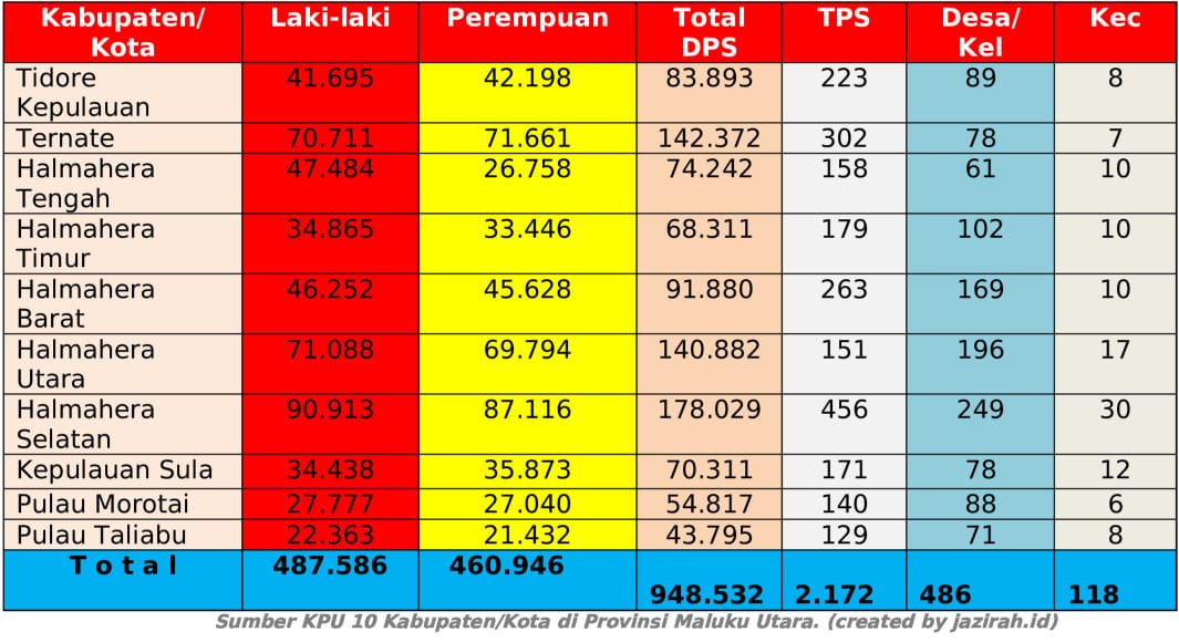 Jazirah Indonesia – Daftar Pemilih Sementara (DPS) di 10 kabupaten/kota di Maluku Utara untuk Pemilihan Kepala Daerah (Pilkada) serentak 2024 berjumlah 948.532 jiwa.
