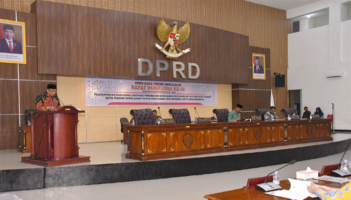 Penyampaian tersebut disampaikan Wali Kota Tidore yang diwakili Sekretaris Daerah Kota Tidore Kepulauan Ismail Dukomalamo yang diagendakan pada Rapat Paripurna ke 16 masa persidangan III tentang penyampaian Ranperda Perubahan APBD Kota Tidore Kepulauan Tahun 2024 Beserta Nota Keuangannya, di Gedung DPRD Kota Tidore Kepulauan, Jumat (23/8/2024).