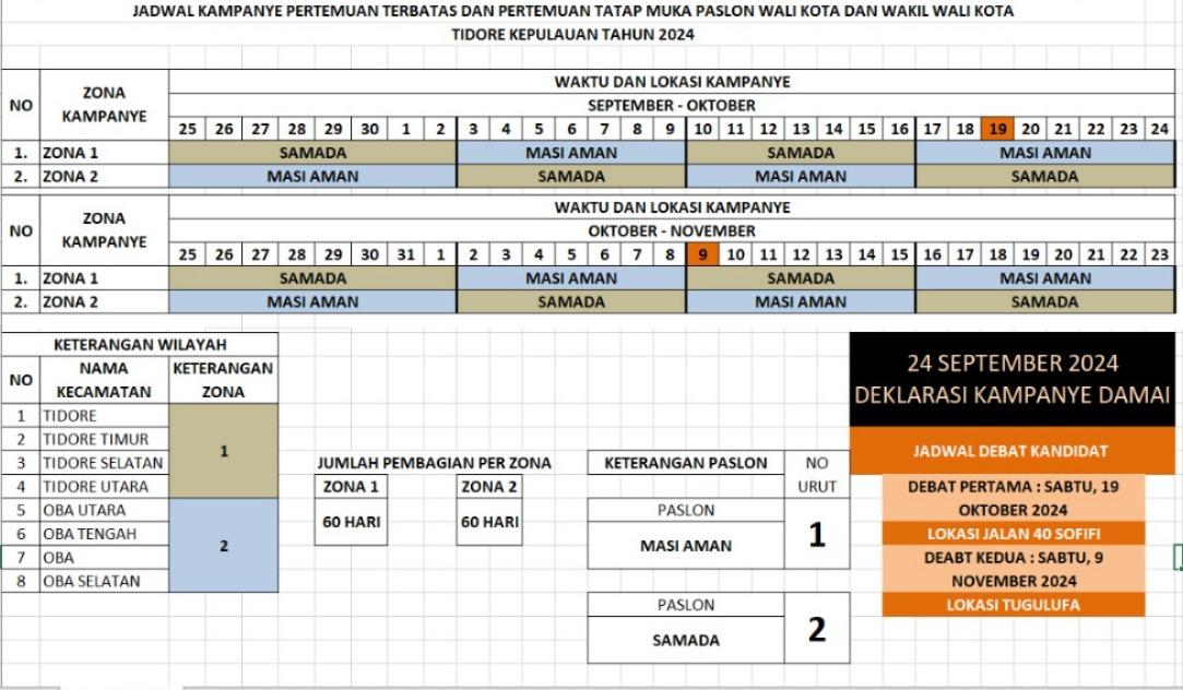“Jadi mulai besok jadwal Masi-Aman itu di Oba (zona 2) selama 8 hari, jadi Sam-Ada di sini (zona 1) selama 8 hari, baru putar lagi,” kata Bahrudin usai rapat terkait kampanye di ruang rapat KPU Kota Tidore Kepulauan, Selasa (24/9/2024).