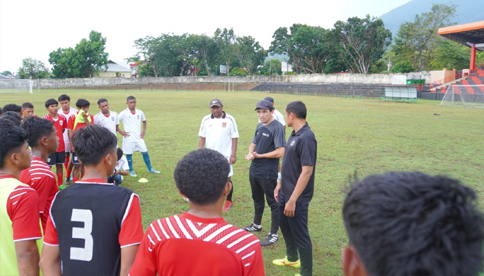 Coach Miquel memberikan materi kepada tim Malut United U16 bersama beberapa pelatih dari Malut United Academy.