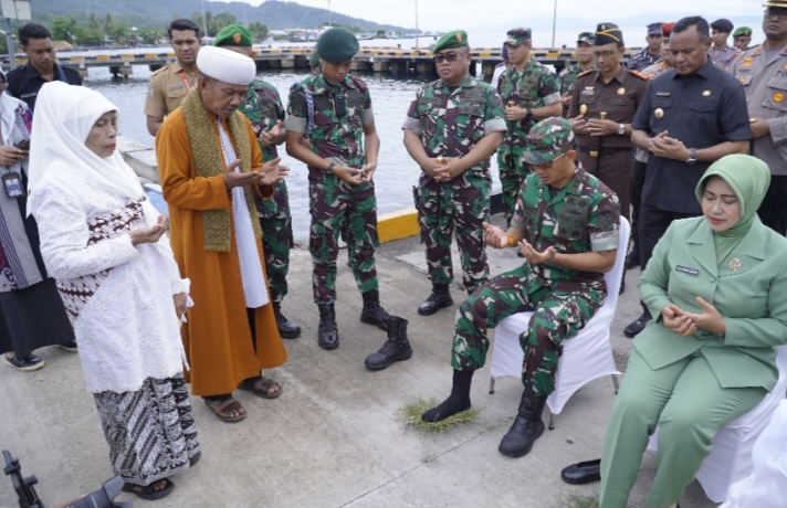 Malutzone – Panglima Kodam XV/Pattimura, Mayjen TNI Putranto Gatot Sri Handoyo didampingi Ketua Persit Kartika Chandra Kirana Daerah XV/Pattimura, Heny Putranto Gatot berkunjung ke Kota Tidore Kepulauan, Senin (10/3/2025). Kedatangan mereka disambut dengan tradisi adat Joko Hale di pelabuhan Trikora.