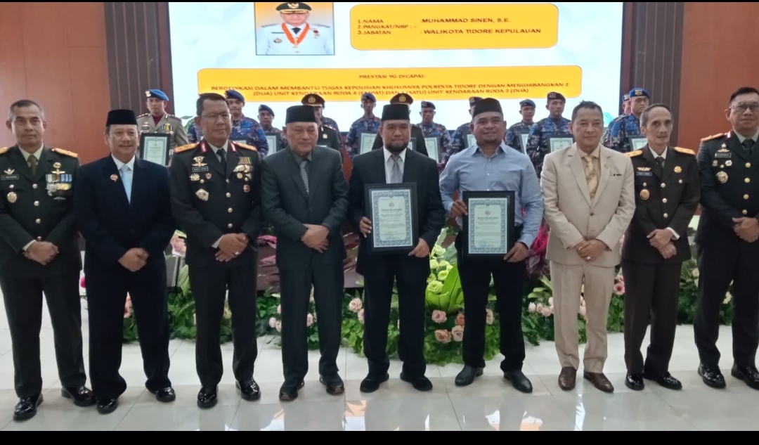 Penghargaan tersebut diterima oleh Wali Kota Tidore yang diwakili oleh Asisten Sekda Bidang Pemerintahan dan Kesra Syofyan Saraha saat menghadiri acara syukuran Hari Ulang Tahun (HUT) Ke-79 Bhayangkara di Aula Kieraha Polda Maluku Utara, Selasa (1/7/2025).