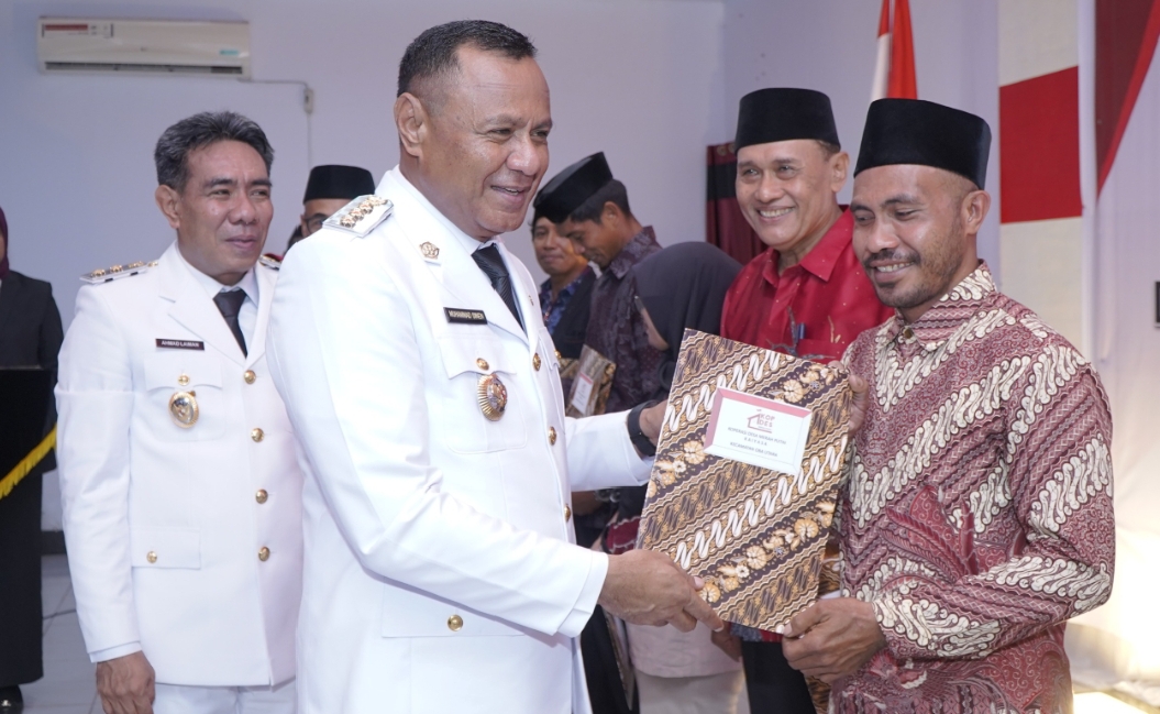 Malutzone – Wali Kota Tidore Kepulauan Muhammad Sinen didampingi Wakil Wali Kota Tidore Kepulauan Ahmad Laiman menyerahkan akta pendirian koperasi desa/kelurahan merah putih (KDKMP) dan sertifikat penilaian kesehatan koperasi tahun 2025 di aula Sultan Nuku kantor Wali Kota, Minggu (17/8/2025).