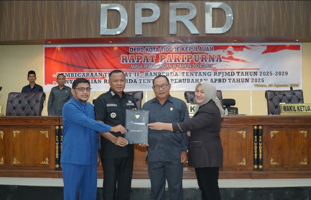 Persetujuan tersebut diagendakan pada rapat paripurna ke-13 massa persidangan III tentang pembicaraan tingkat II Ranperda RPJMD Kota Tidore Tahun 2025-2029 yang dipimpin langsung Ketua DPRD Kota Tidore Ade Kama, di ruang rapat paripurna DPRD, Rabu (20/8/2025).