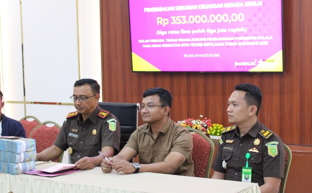 Malutzone – Kejaksaan Negeri (Kejari) Tidore Kepulauan menerima pengembalian kerugian negara sebesar Rp353 juta dari pihak terdakwa perkara tindak pidana korupsi pekerjaan Puskesmas Galala, Oba Utara tahun 2022, Selasa (19/8/2025).
